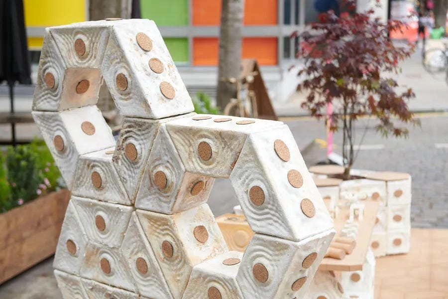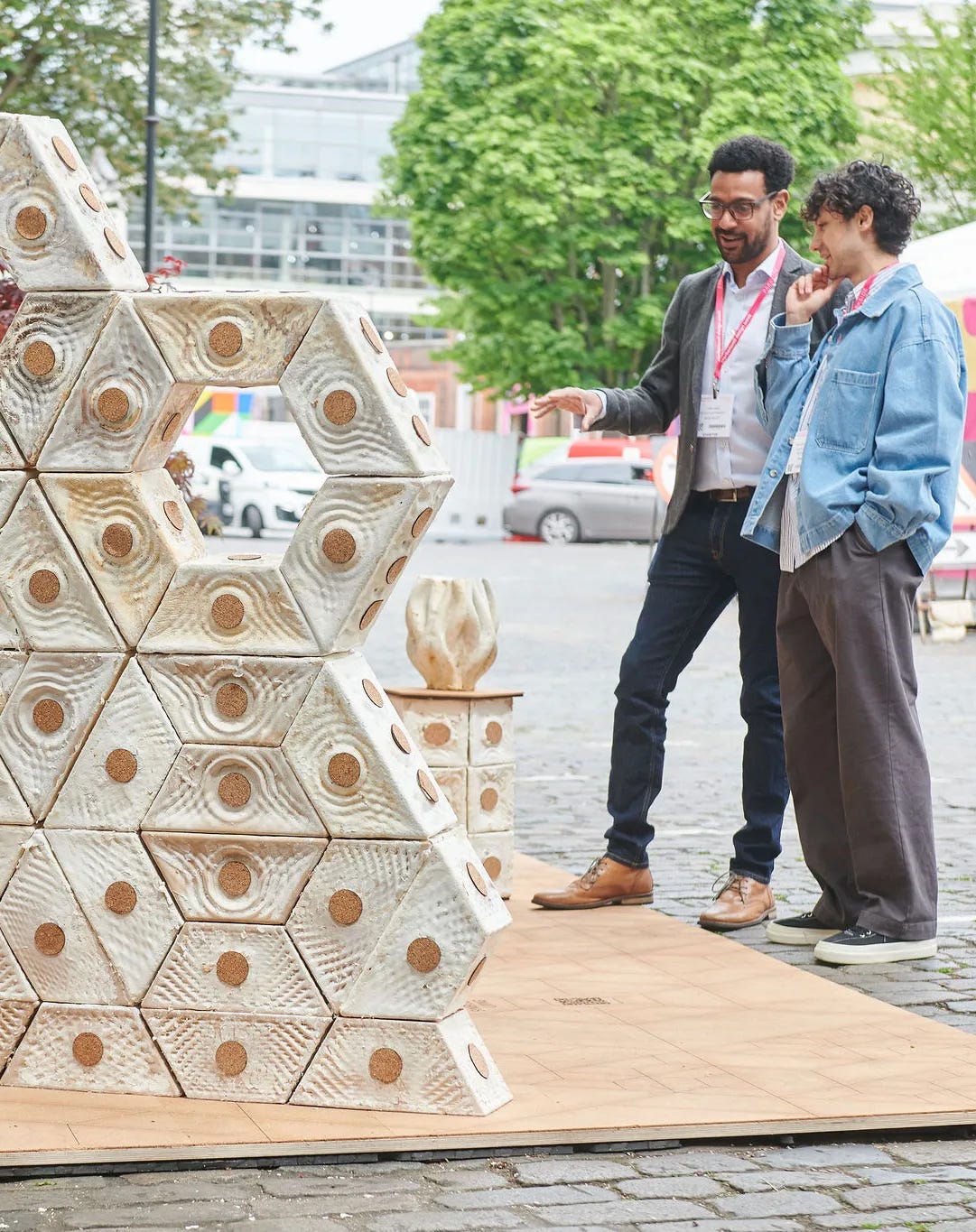 Our first showcase is PLP Lab’s mycelium installation at Clerkenwell Design Week 2023. The 100% bio-based symbiocene installation is a combination of fun and engineered 3D printer timber shells. The installation was made from mycelium modular blocks which demonstrate a possible future where civilization and nature can entertain a positive symbiotic relationship. The installation was made up of 84 blocks and was arranged to form abstract seating, spatial formations, partitions and a table. During the event, attendees and visitors interacted with this structure and got to experience firsthand, the symbiotic relationship between fungi and humans.
